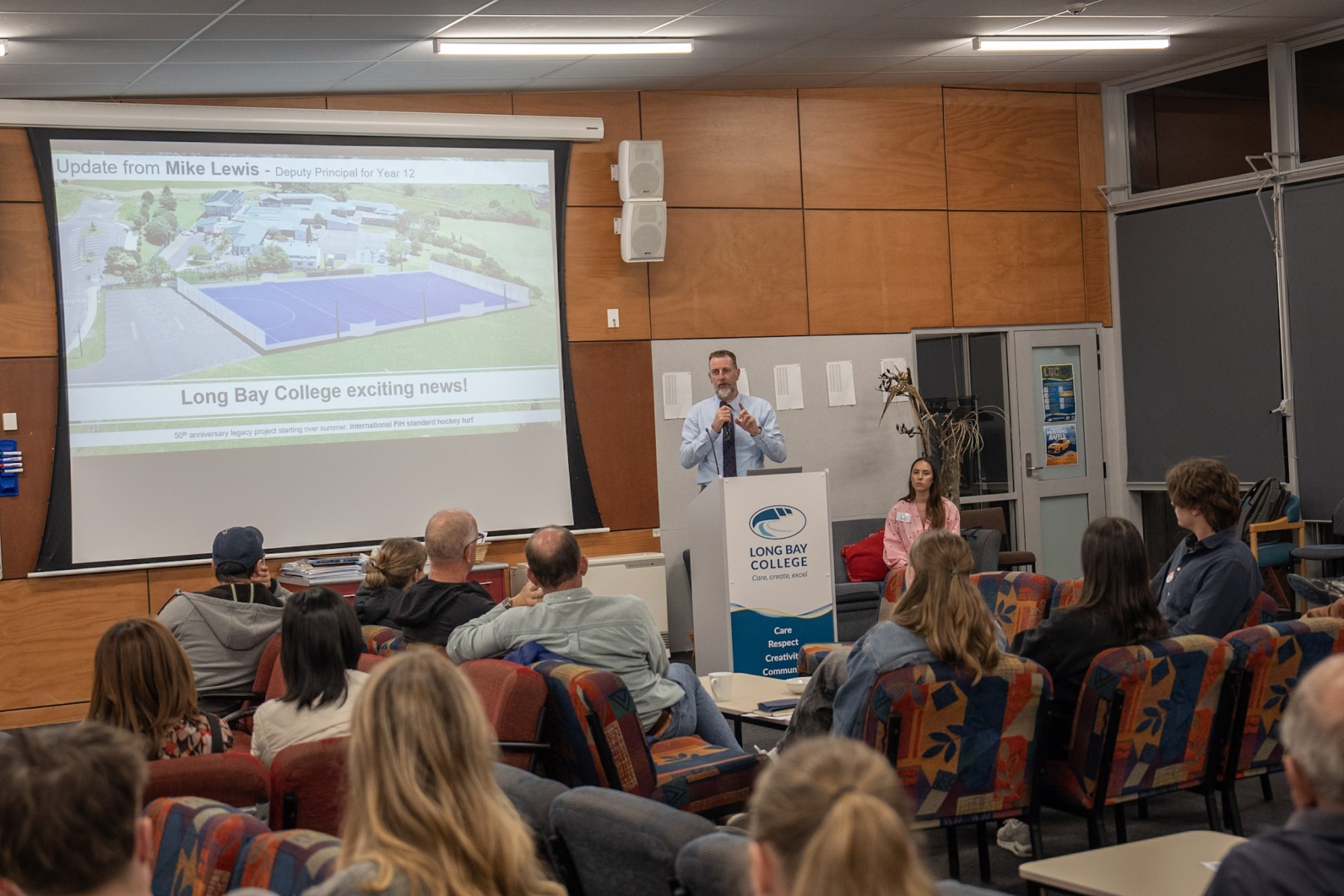 - Mike Lewis (Deputy Principal, Long Bay College) who announced a legacy project to install an amazing international FIH standard hockey turf on the land adjacent to Long Bay Primary work commencing summer 2025/2026, plus the refurbishment of the much-loved “nostalgic” O Block commencing in April 2026.